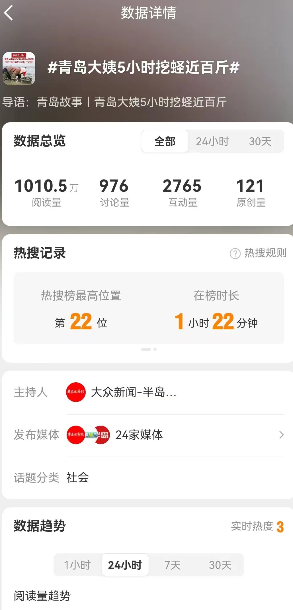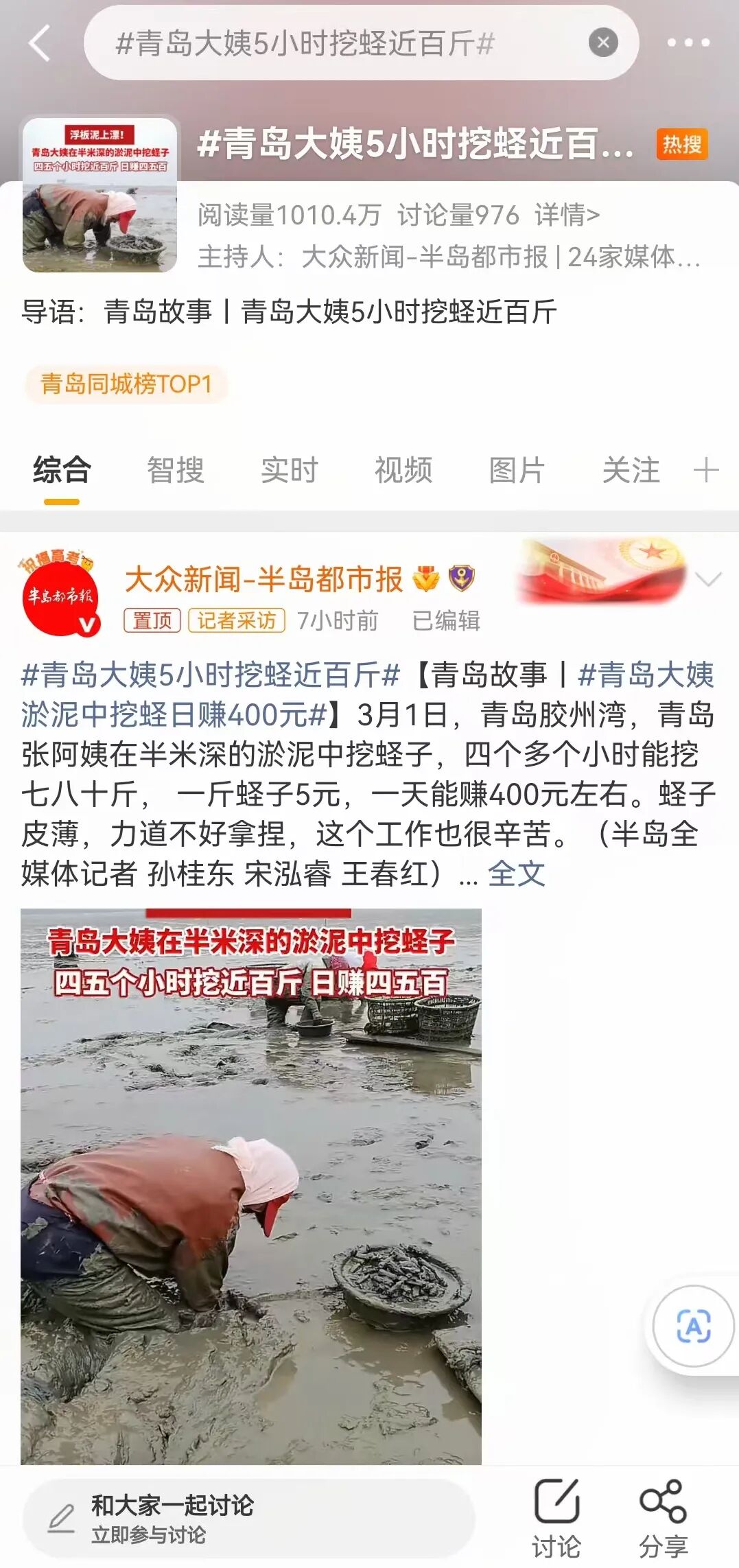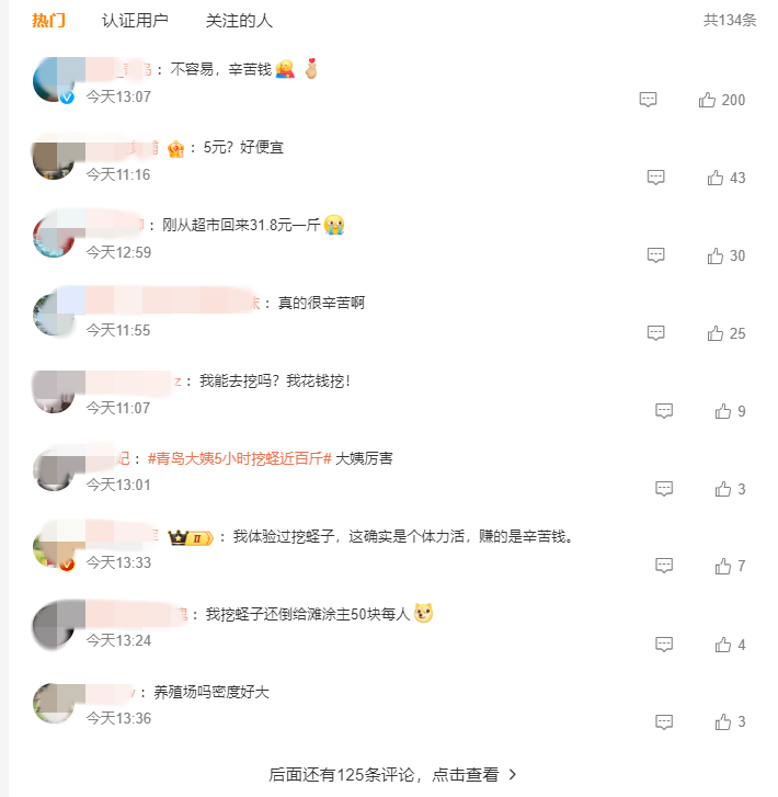近日,#青岛大姨5小时挖蛏近百斤#登上微博全国热搜引发网友关注点赞!