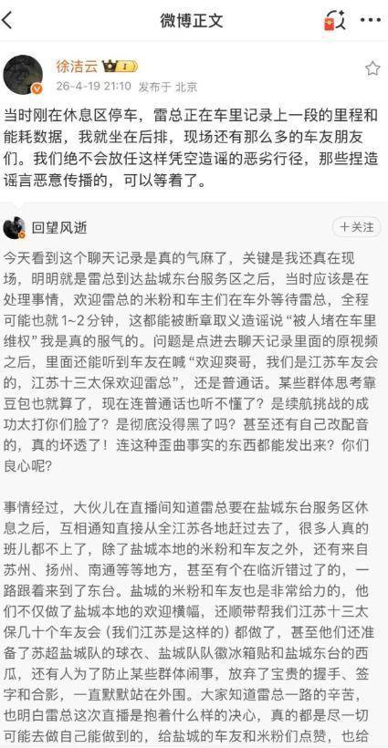 现场亲历博主也发声驳斥谣言。据其介绍,事发地为江苏盐城东台服务区,雷军当时在车内短暂处理事务,闻讯赶来的江苏各地米粉与车友在车外等候迎接,全程仅一两分钟。视频中清晰可闻车友喊着 “欢迎爽哥,江苏十三太保车友会欢迎雷总”,还有人特意制作了欢迎横幅。