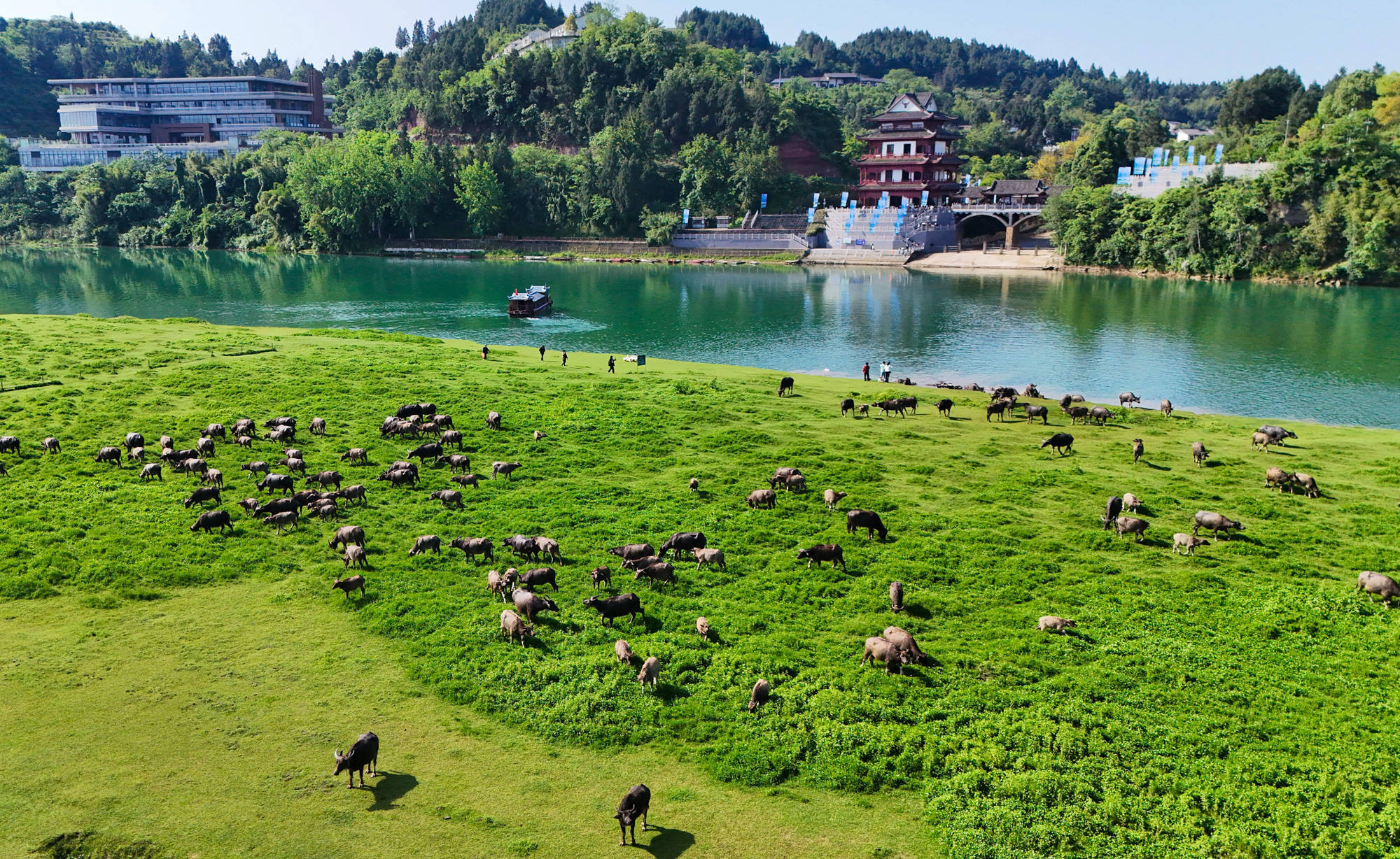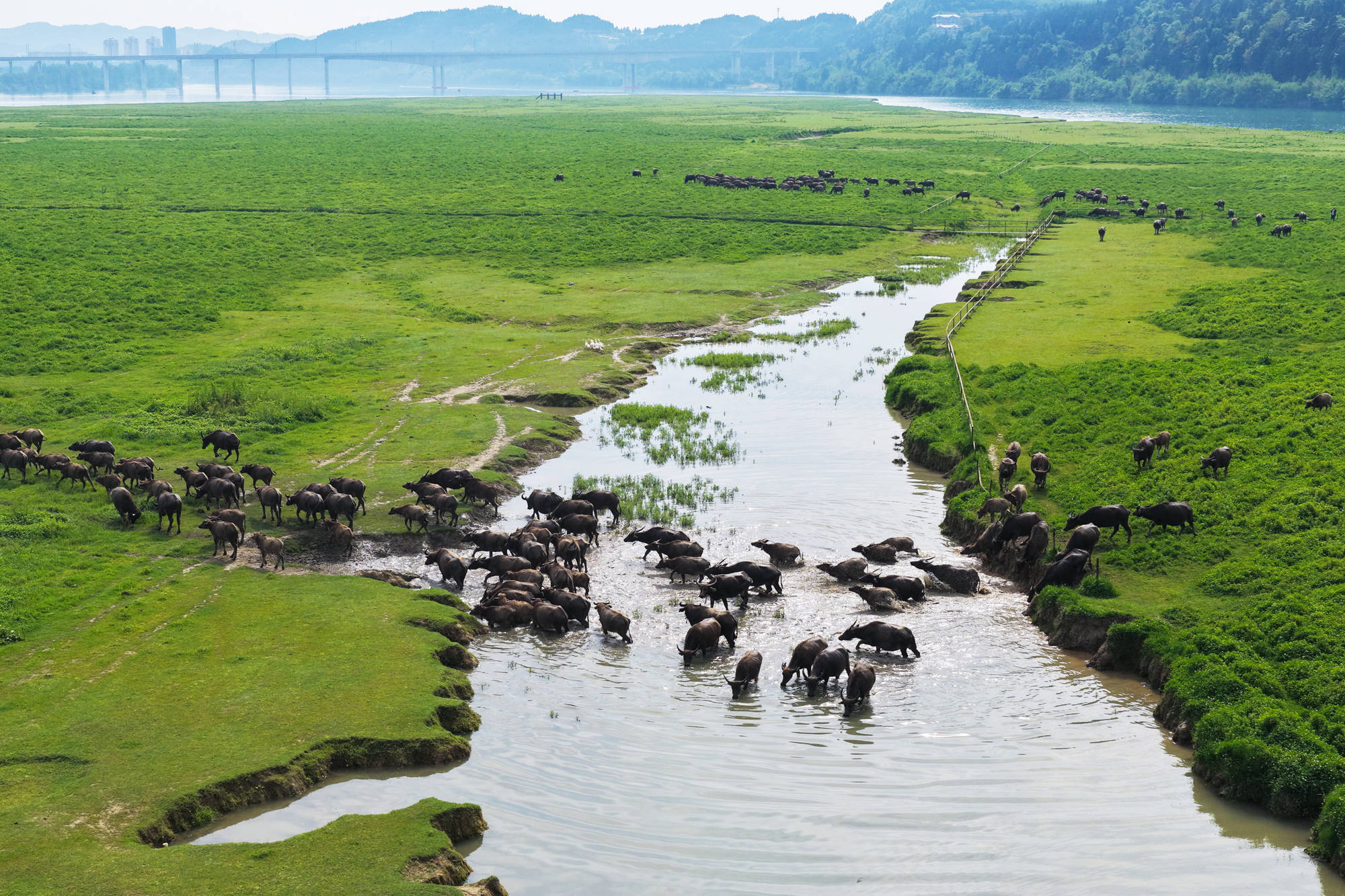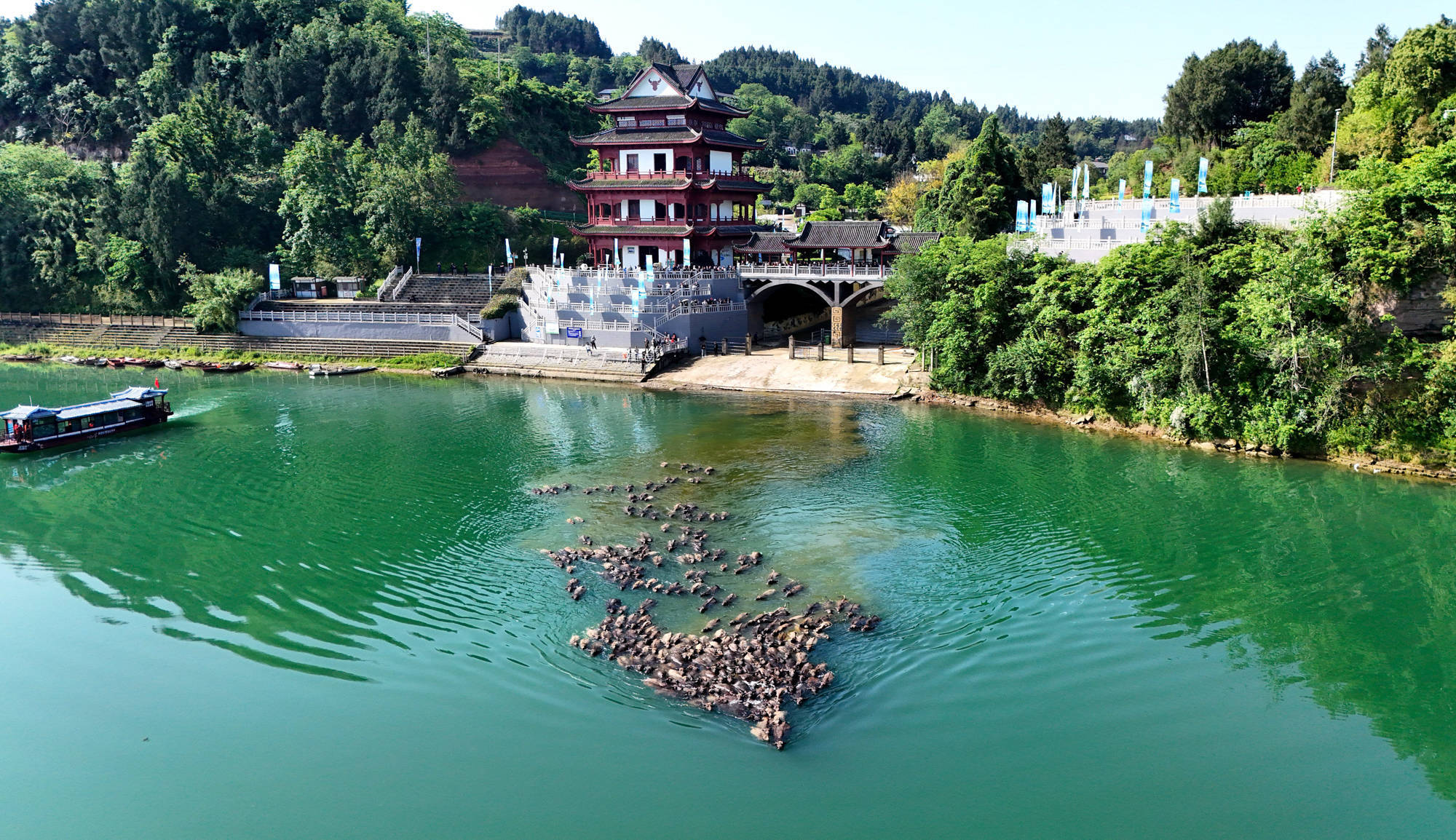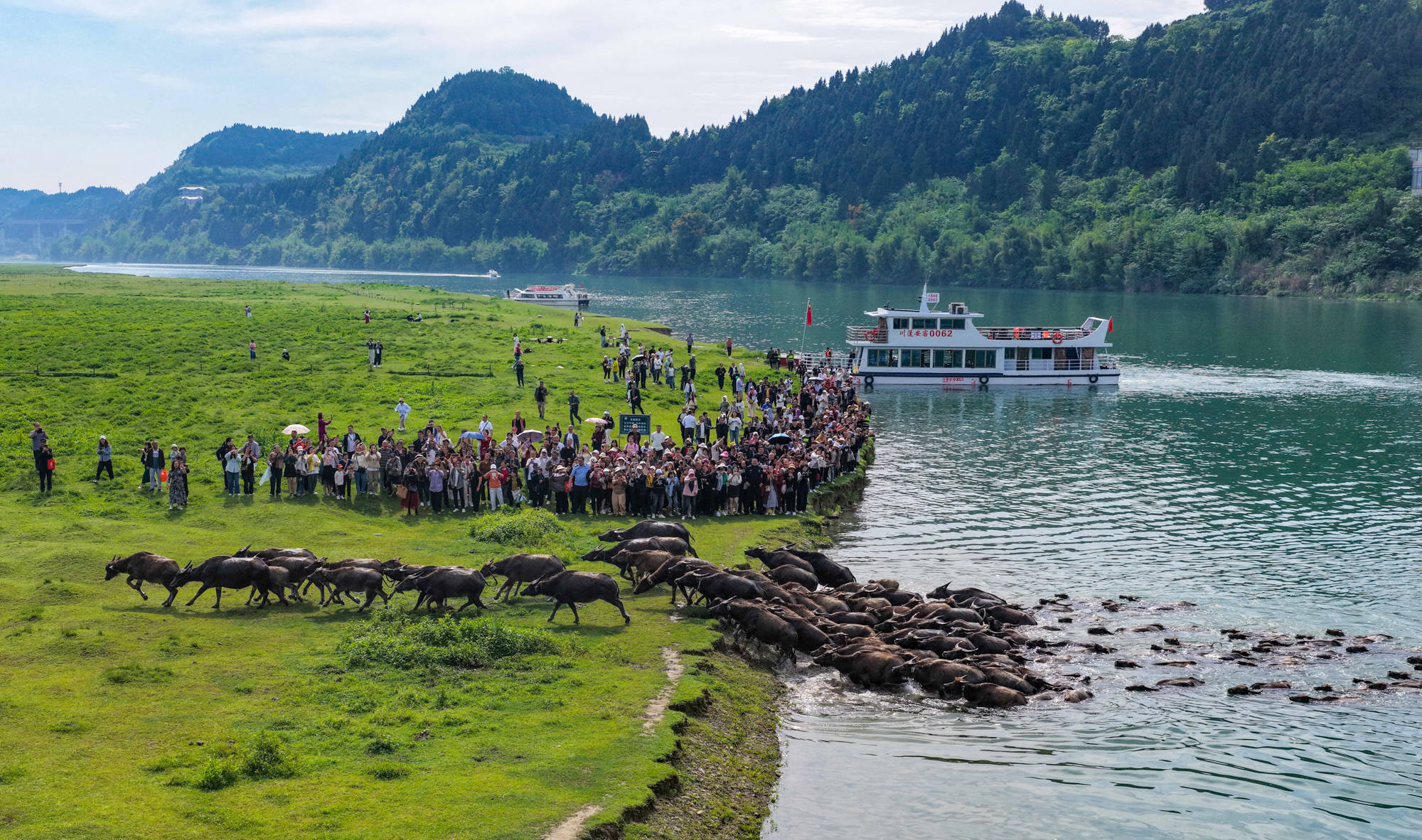 每年4月底至10月初,在四川省南充市蓬安县境内嘉陵江畔,成群水牛在头牛率领下渡江,前往江心岛屿觅食,黄昏时分再下水回游上岸归栏,成为当地一道独特的景观,吸引不少游客前来观看。