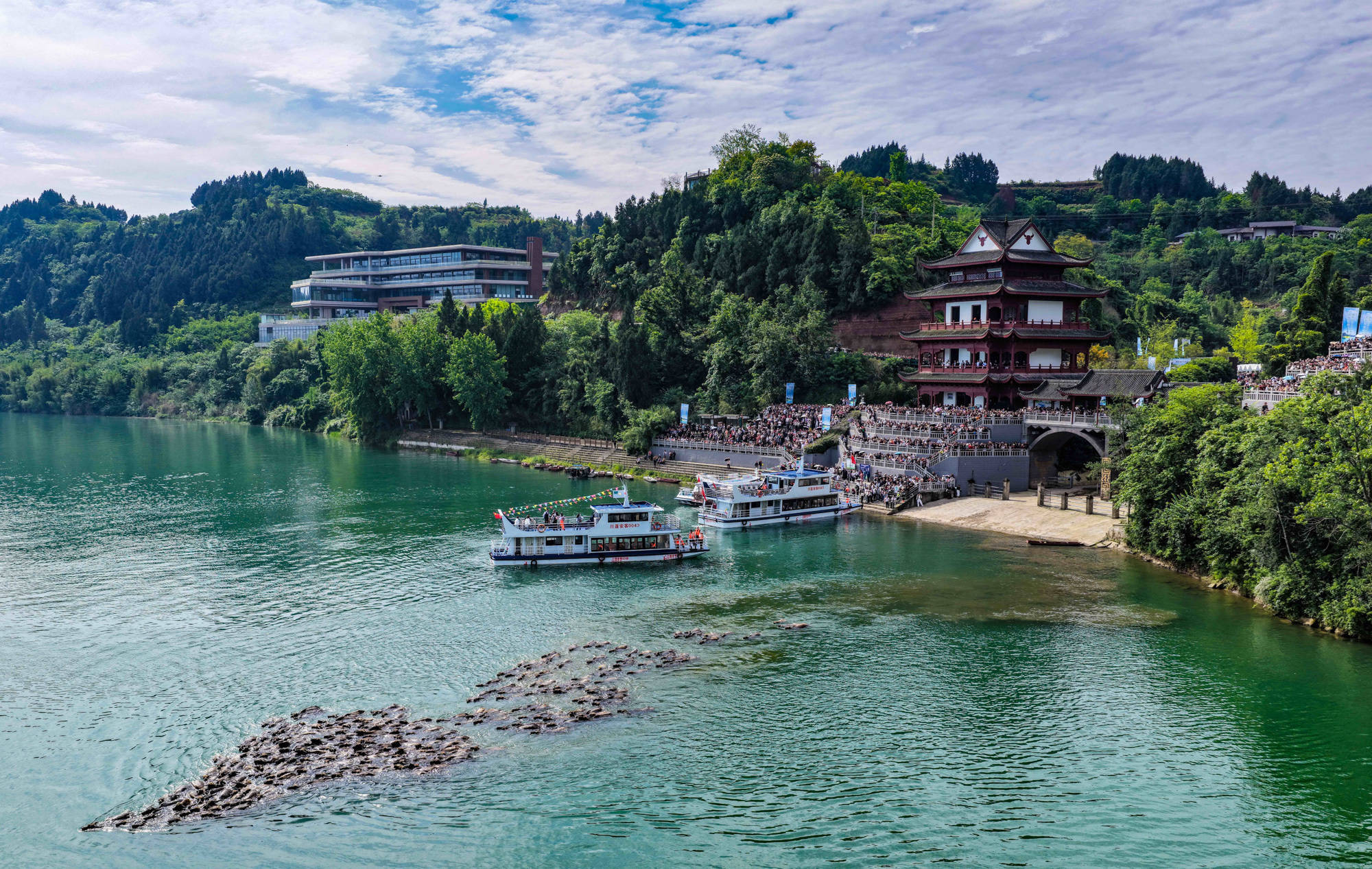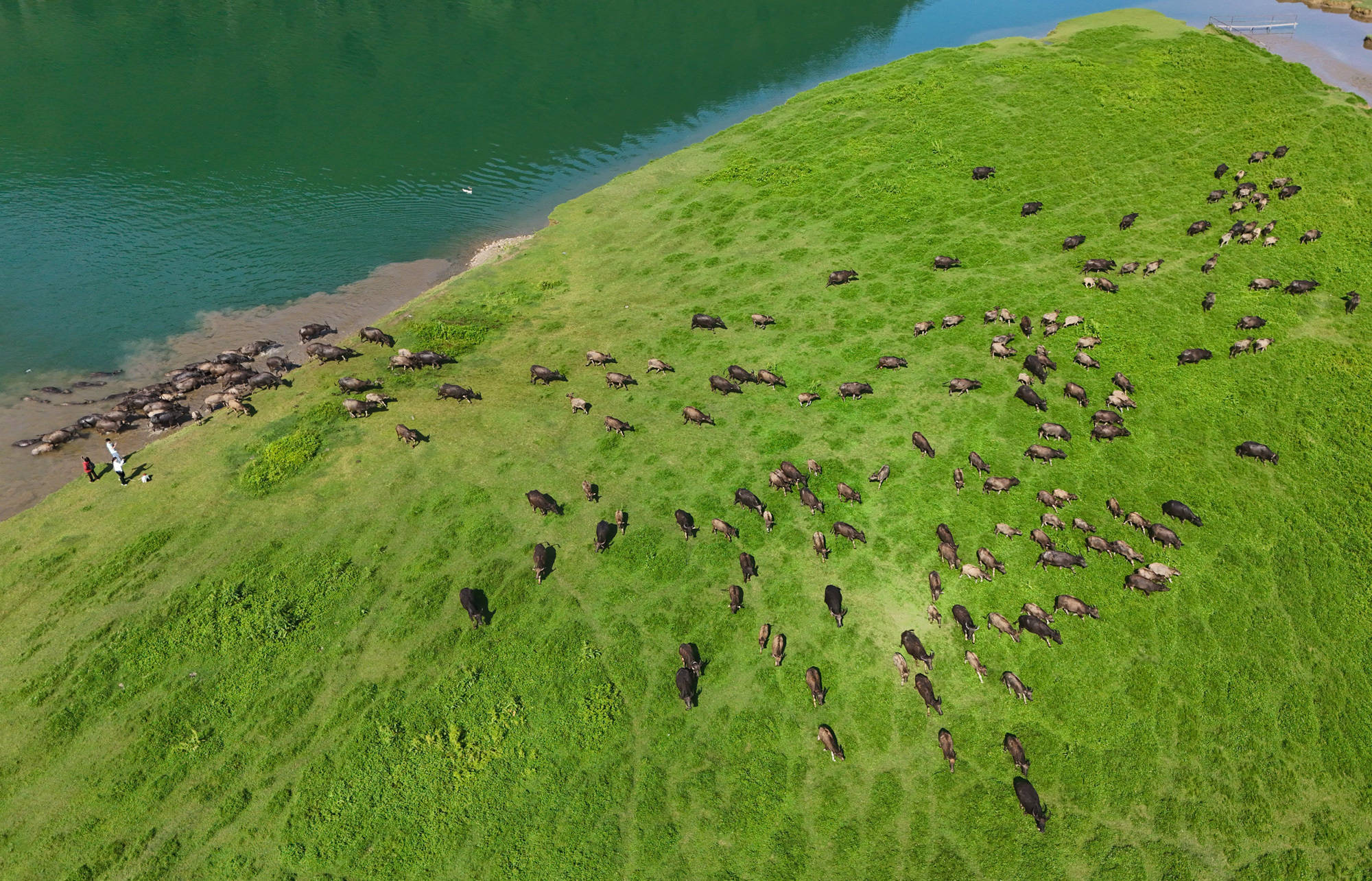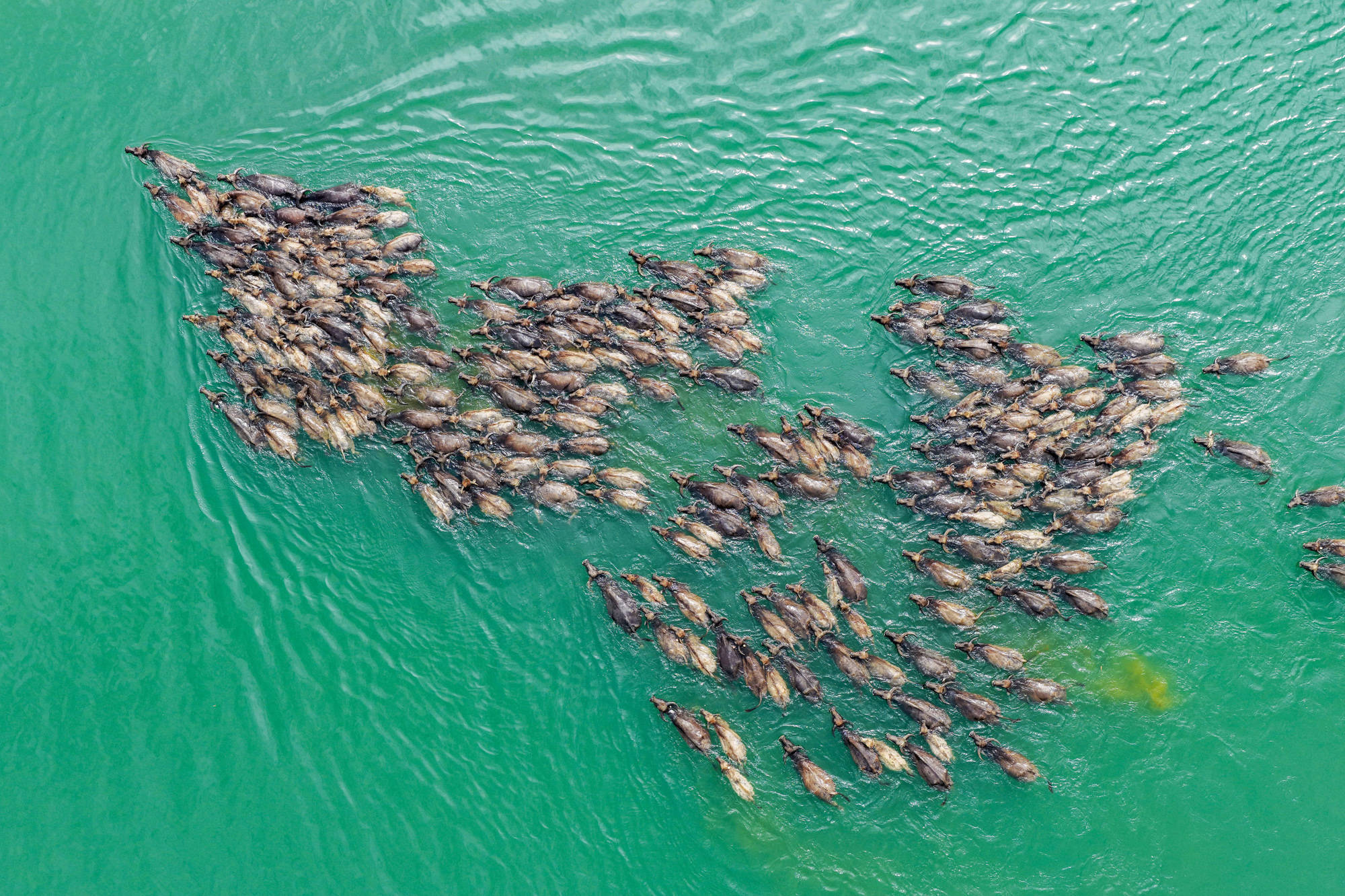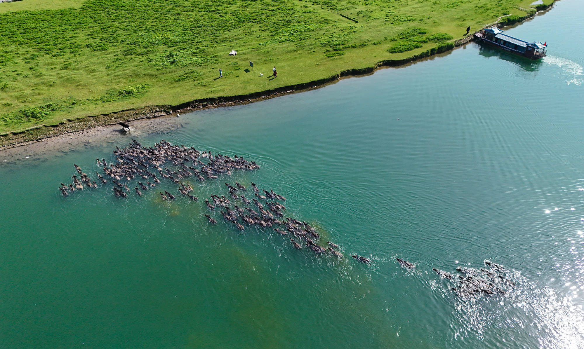 每年4月底至10月初,在四川省南充市蓬安县境内嘉陵江畔,成群水牛在头牛率领下渡江,前往江心岛屿觅食,黄昏时分再下水回游上岸归栏,成为当地一道独特的景观,吸引不少游客前来观看。