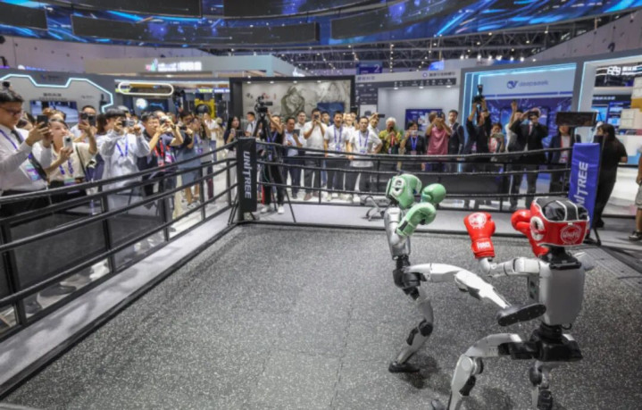 在第四届全球数字贸易博览会数智未来主题展区的杭州六小龙专区,宇树科技的人形机器人在进行格斗擂台赛。新华社记者徐昱摄