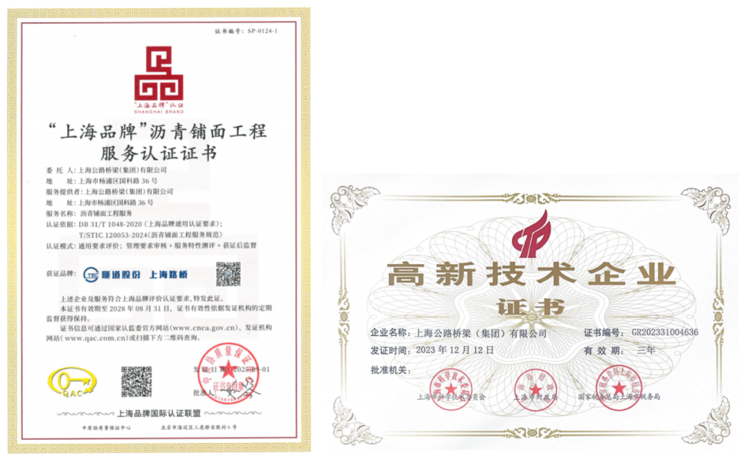 除了公路工程施工总承包特级资质,隧道股份上海路桥还拥有市政公用工程施工总承包特级资质、国家高新技术企业认定、“上海品牌”认证等多张硬核名片。一张张证书、一份份荣誉,见证了上海路桥的“来时路”,更激励着隧道人向着更高的目标攀登。