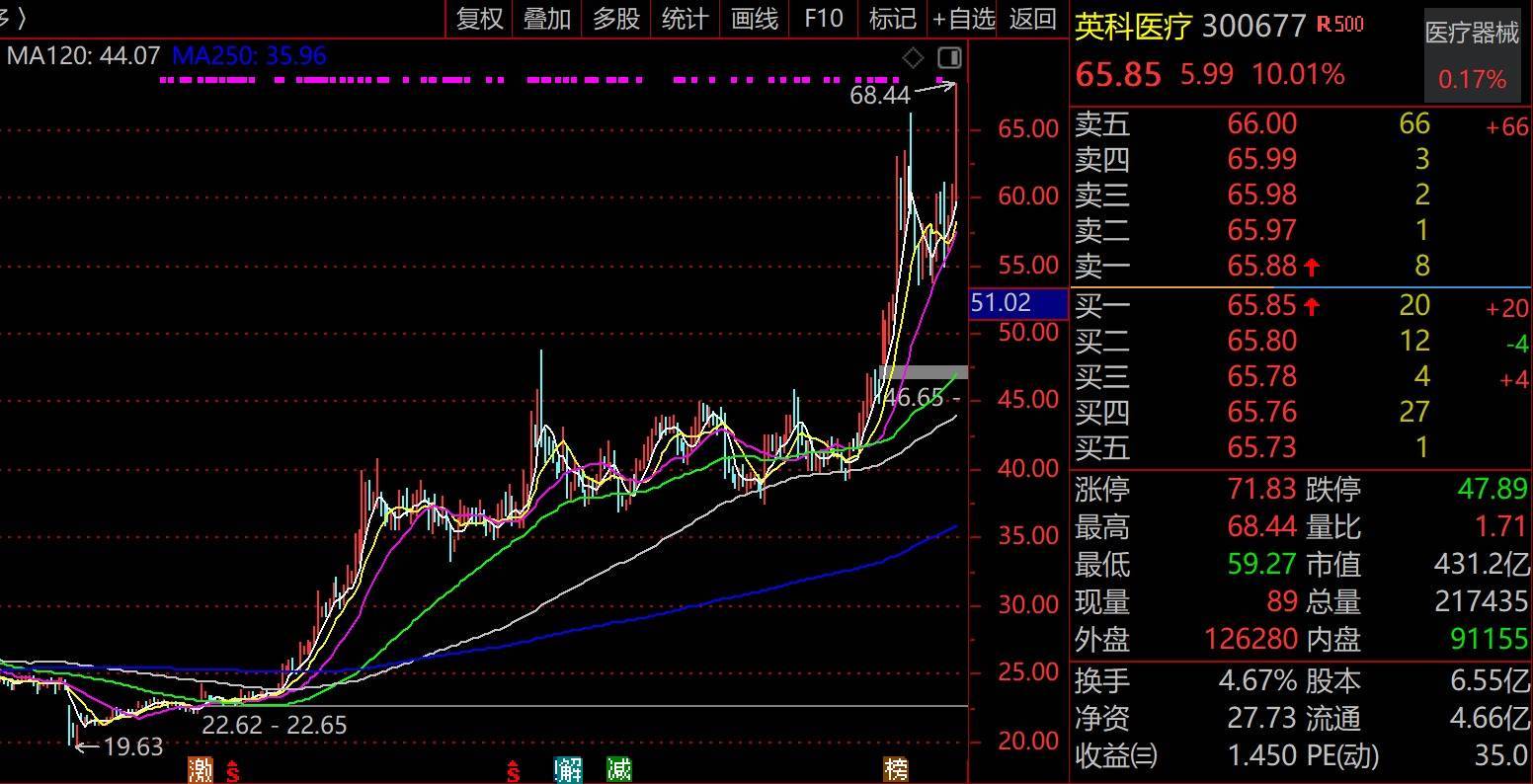 值得注意的是,英科医疗本轮上涨势头强劲,股价已创下4年来新高。近一年时间,股价从不足20元,一路上涨至68元上方,涨幅超过2倍。该股在医疗耗材板块全线爆发的背景下,表现尤为突出,显示出龙头企业的强势地位。