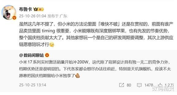 目前已经有第三方爆料显示小米17系列正在冲击200万激活量,个人认为以目前速度发展下去,加上双11期间再来点优惠措施,年底前有望达到400万激活量,这几乎相当于国内部分友商旗舰机型整个生命周期的销量,面对这种情况,友商似乎是有点慌了。