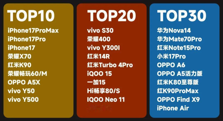 iPhone17ProMax;iPhone17Pro;iPhone17;荣耀X70;红米K90;荣耀畅玩60/M;OPPO A5X;vivo Y50;vivo Y500;小米17ProMax;